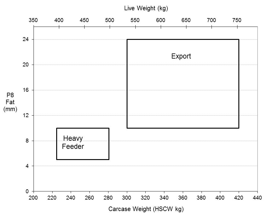 Well-defined specifications have existed for many years for Australian cattle targeted at particular market endpoints. The primary carcase parameters have been hot carcase weight, age (teeth) and P8 fat depth, with values outside preferred ranges attracting discounts from processors. Carcase grids containing the discounts can be obtained from meat processors.