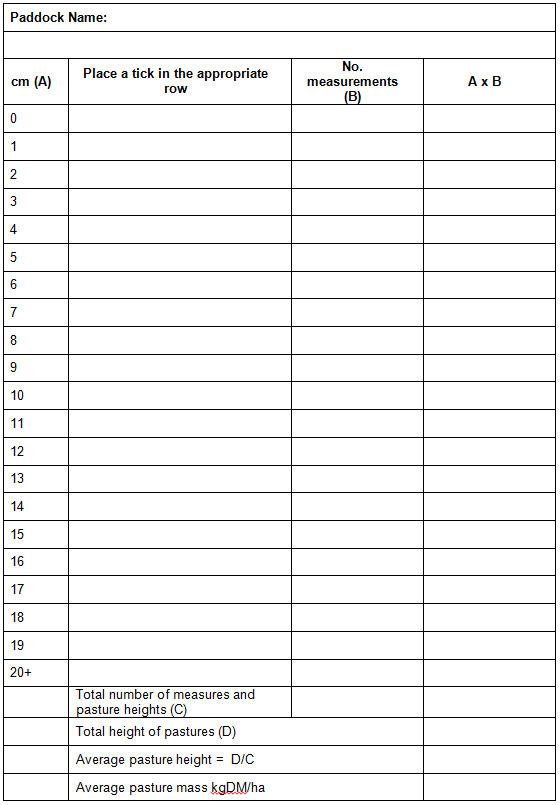 Use a 1cm thick dowel about 30cm in length. Draw a mark 0.5cm from the bottom, then every 1cm along the stick. Readings between 0.5cm and 1.5cm will be recorded as 1cm, readings between 1.5cm and 2.5cm as 2cm etc. Measure the height from at least 50 sites chosen at random as you cross the paddock. The best way is to throw the stick as you walk across the paddock.