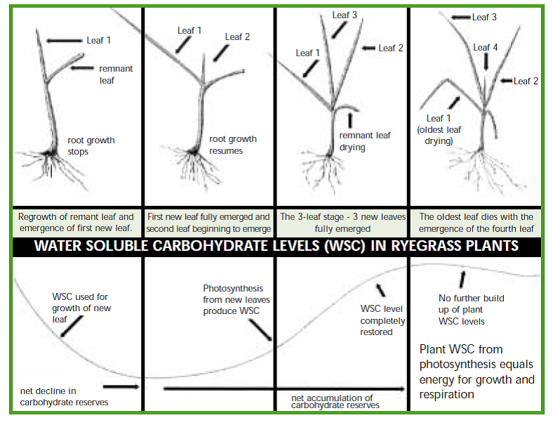 Assessment of phenology is made for target species and involves the examination of individual tillers from perennial grass clumps to count the number of new leaves on each tiller. The number of leaves is a good indicator of the start of senescence (dying) of the oldest leaf on each tiller. Generally the ideal number lies between three and four tillers; however, the number of leaves varies from species to species. Figure 1 indicates the correlation between levels of water soluble carbohydrates and leaf number for perennial ryegrass.