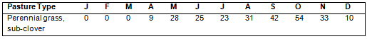 Estimated daily pasture growth rate (mid-month) of specific pasture types (kg DM/ha/day)